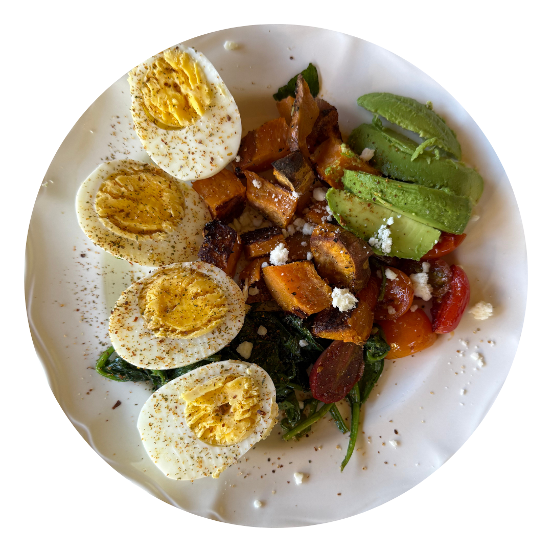 Post-workout, it’s time to fuel. I make a high-protein smoothie that usually includes frozen fruit, greens, nut butter or seeds, protein powder, and a little healthy fat like avocado or flax oil.